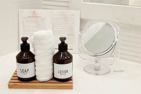 חדר רחצה יפהפה לכלה, עם כניסה פרטית למקווה, ואזור קבלה נפרד לבנות המשפחה המלוות אותה ביום מיוחד זה.